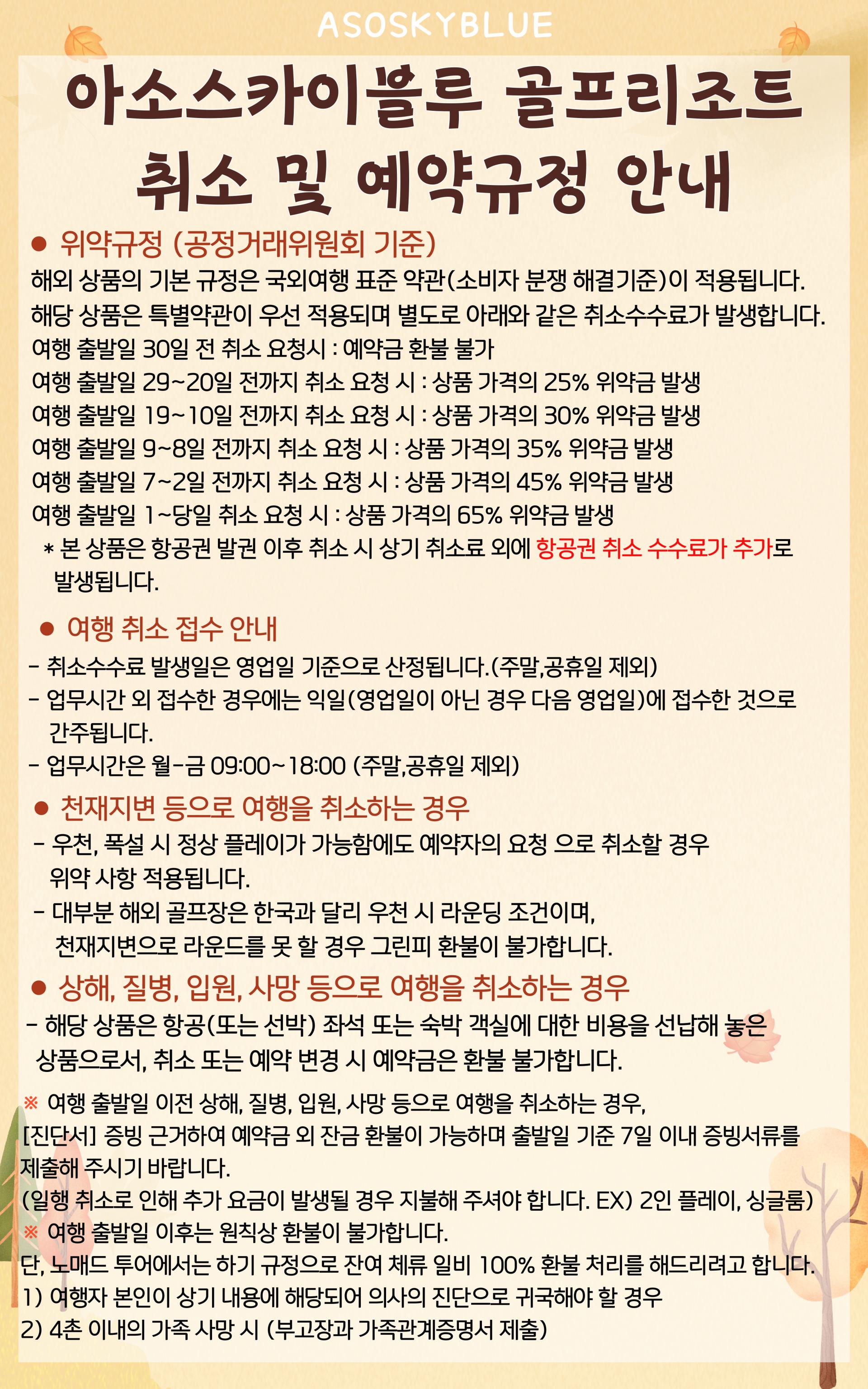 · 예약 확정 이후 취소 시 취소 시점에 따라 취소료 발생 됩니다. 단, 항공권의 경우에는 약관과 별개로 발권 이후에는 항공사 티켓 규정에 따라 위약금 발생됩니다.