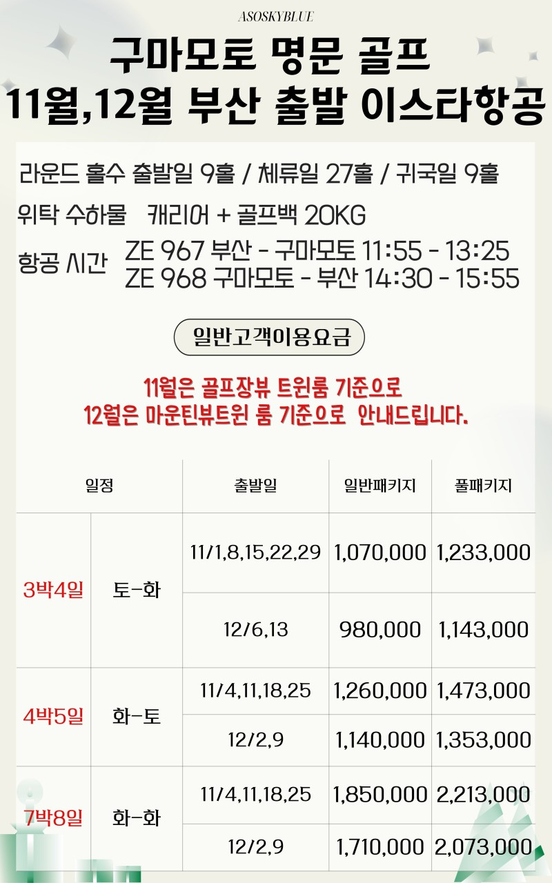 [일본-구마모토]◐김해출발◑ 아소스카이블루 골프&리조트 4/5일