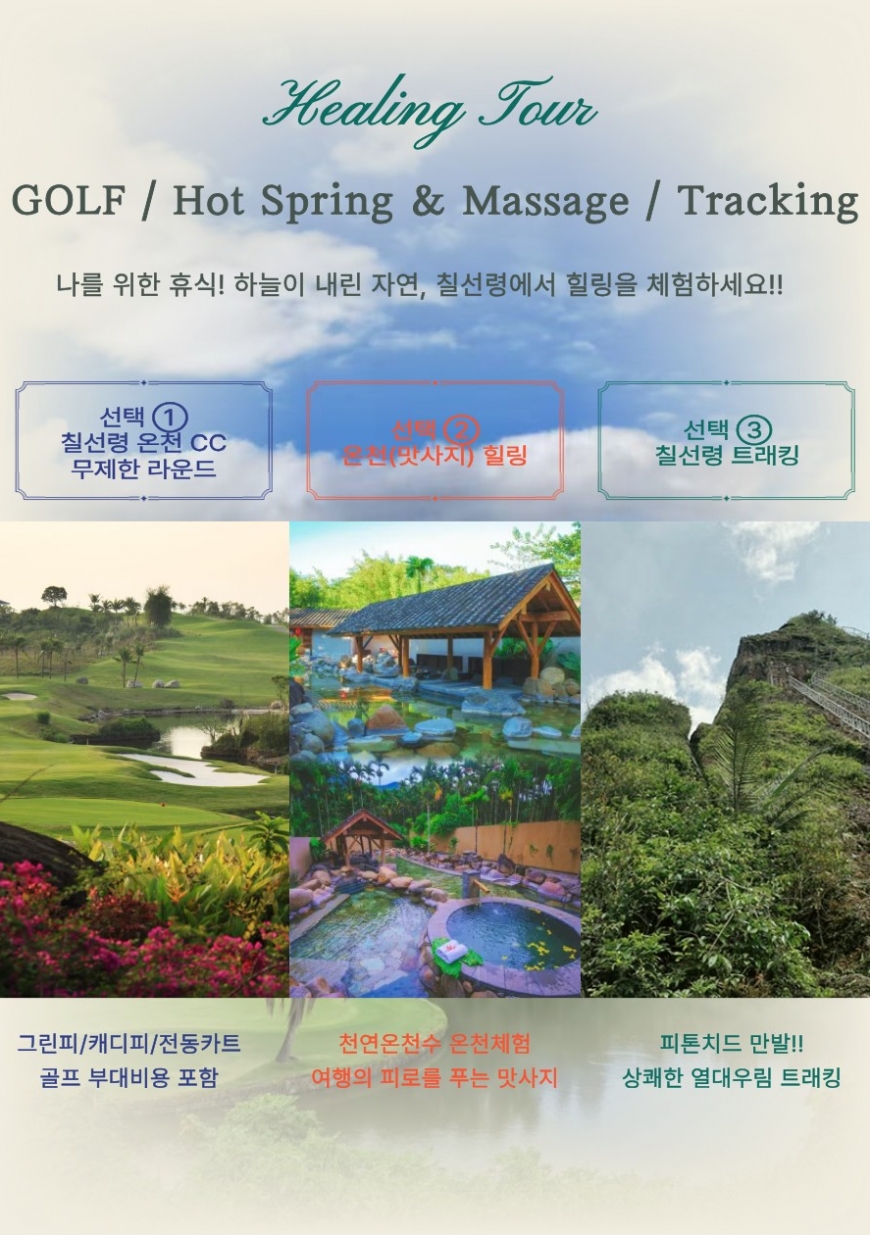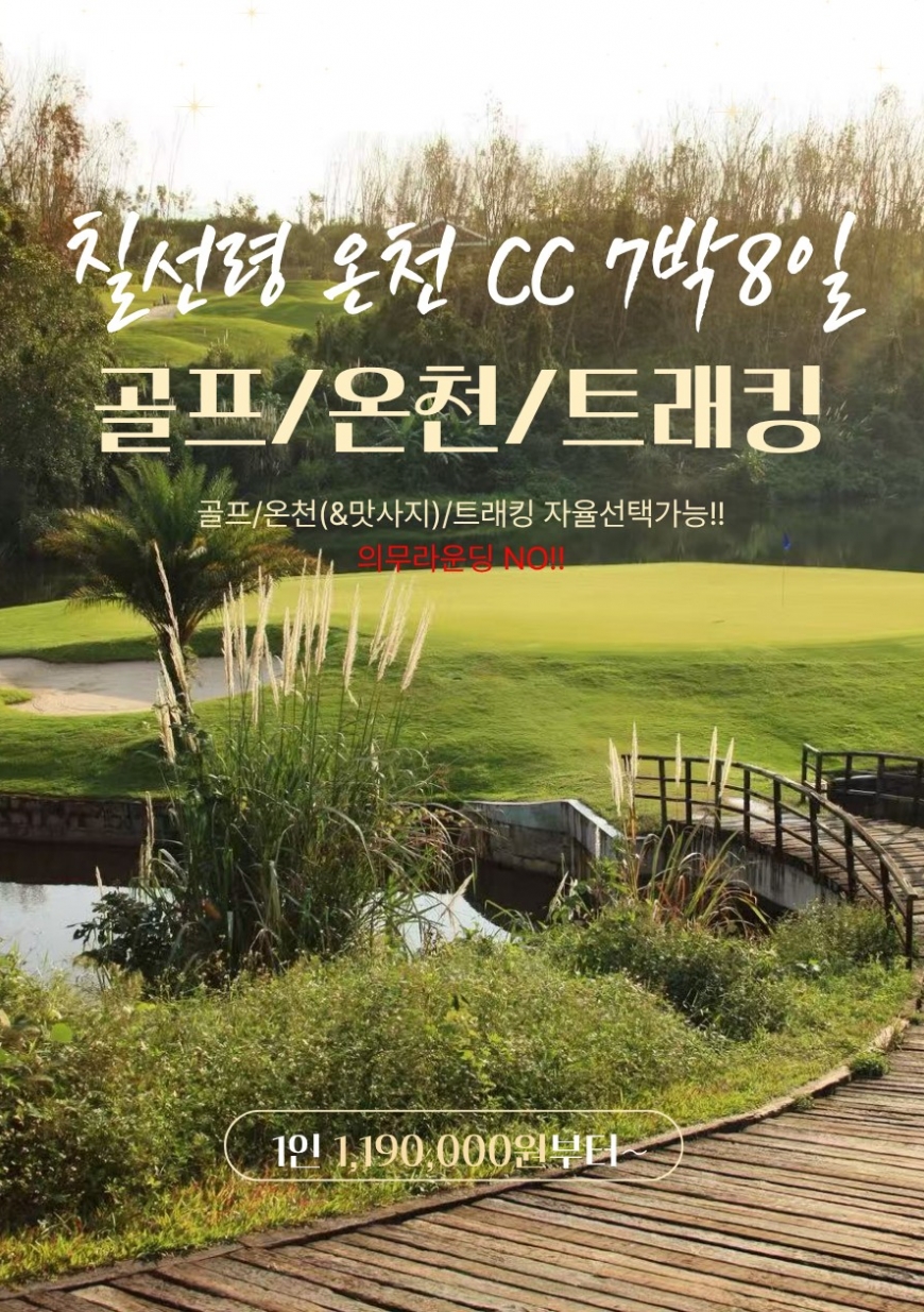 호텔 조식 후 골프장으로 이동 ⛳️칠선령 온천 CC 18홀~36홀 라운딩 └ 선택 ① 골프 라운드 대신 온천&맛사지 선택 가능 └ 선택 ② 골프 라운드 대신 칠선령 트래킹 선택 가능 석식 후 호텔 투숙 ✳️칠선령말레이온천리조트 동급 [2인1실] |