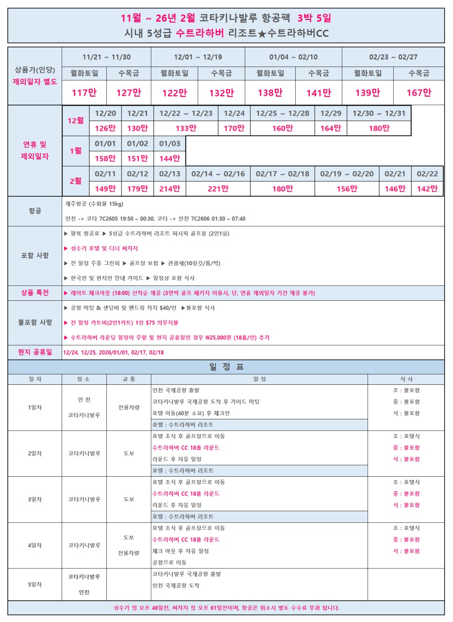 ·포함내역 왕복항공권, 리조트숙박, 조식, 그린피[18홀씩], 골프장보험, 관광세, 여행자보험