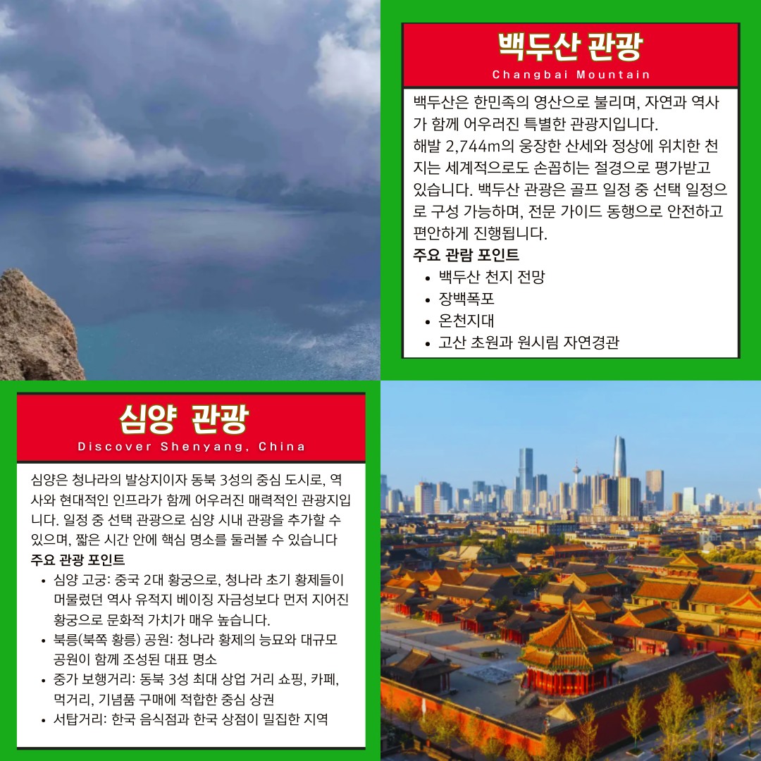 무제한 라운드로 골프에 집중하고, 백두산과 심양 관광까지 더할 수 있는 프리미엄 선택형 골프여행.