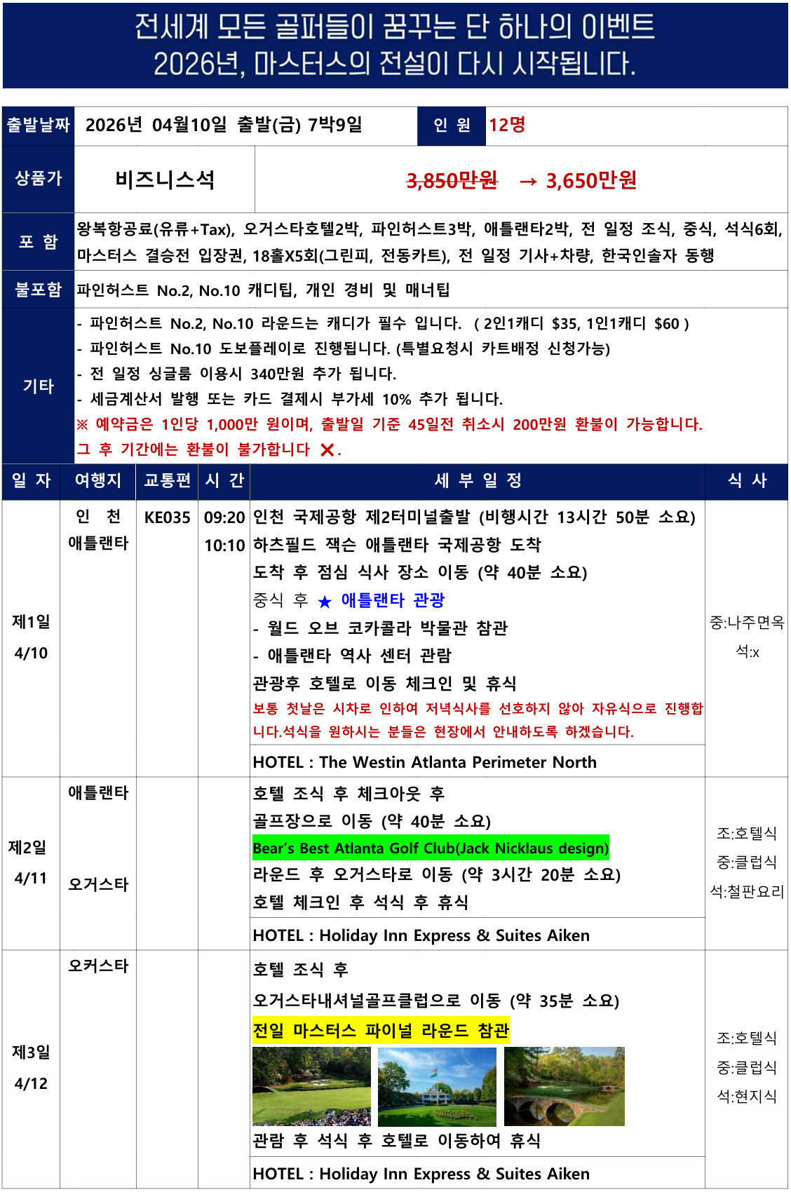 ·포함내역 | 왕복항공료(유류+Tax / 비지니스좌석), 오거스타호텔2박, 파인허스트3박, 애틀랜타2박, 전 일정 조식, 중식, 석식6회, 마스터스 결승전 입장권, 18홀X5회(그린피, 전동카트), 전 일정 기사+차량, 한국인솔자 동행 |