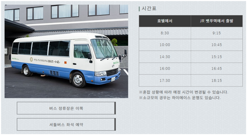 상기 배차시간 등 참고하시어 사전예약 또는 일반택시(약 3~4천엔) 이용이 가능합니다. 차량 15~20분 내외 소요 |