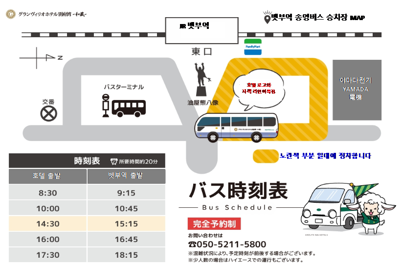상기 배차시간 등 참고하시어 사전예약 또는 일반택시(약 3~4천엔) 이용이 가능합니다. 차량 15~20분 내외 소요