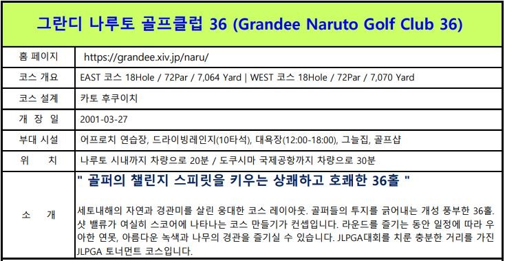 도쿠시마 아와오도리 국제공항 도착 현지 직원 미팅 후 골프장으로 이동 (이동시간 약 30분) 골프장 도착 후 라운드 준비 ⛳️그란디나루토 동코스 또는 서코스 - 9홀 라운드 라운딩 종료 후 리조트 체크인 ♨ 아로마 하우스에서 스파 즐기기 ~♨ 석식(이태리식/중국식/일본식 중 선택) 후 호텔 내 자유시간 ✳️ 그란디 나루토 리조트 [2인1실] [꼭! 확인 해 주세요~] - 도착 당일 골프 라운드는 골프장 운영상의 관계로 9홀만 가능합니다. - 1일차 골프장 도착 후 바로 라운드 준비하셔야 하므로 점심은 기내식, 간편식 등으로 미리 드시길 바랍니다. - 도착일 9홀 및 체류일 27홀 플레이 시 일몰로 인해 라운드를 못할 경우 환불은 없습니다. - 셀프플레이 기준. 캐디 예약 불가능합니다. - 석식은 일식 가이세키 2번, 이태리식 코스요리 1번으로 진행. (현지 상황에 따라 변동될 수 있음) - 카트 운전 시 발생되는 사고에 대해서는 여행자 보험 처리 불가합니다.(100% 운전자 과실) 카트 탑승 시 항상 손잡이를 잡아 주시고, 운전은 가급적이면 면허증 소지자가 운전 해 주세요. - 해당 상품은 항공기 지연, 천재 지변 등의 기상 악화로 인해 포함 된 일정을 진행 하지 못할 경우에도 환불 되는 금액 없습니다.(우천/설천 동일 적용) - 취소시 출발 30일전부터 현지 취소수수료 발생합니다. - 본 상품은 예약 시점일 기준 항공 좌석 및 현지 호텔 상황에 따라 요금이 변경 될 수도 있습니다. |