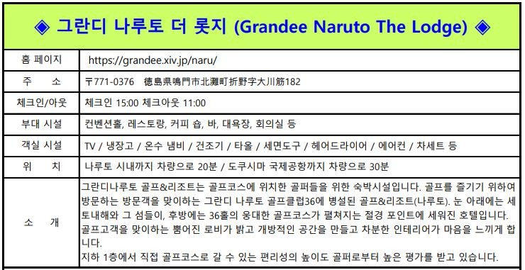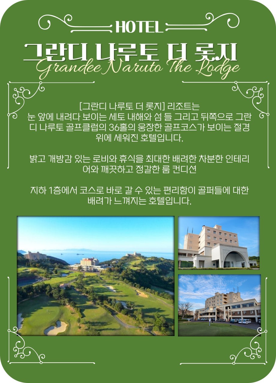 리조트 조식 후 골프장으로 이동 (도보) ⛳️그란디 나루토 동코스 또는 서코스 - 18홀 셀프카트 플레이 라운드 종료 후 리조트 내 휴식 ♨ 아로마 하우스에서 스파 즐기기 ~♨ 석식(이태리식/중국식/일본식 중 선택) 후 호텔 내 자유시간 ✳️ 그란디 나루토 리조트 [2인1실] |