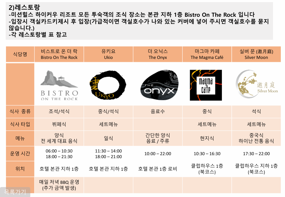 해구 국제공항 도착 직원 미팅 후 미션힐로 이동 체크인 후 휴식 ✳️ 해구 미션힐 리조트 (프리미어룸 /2인1실) [꼭~ 확인 해 주세요!] - 미션힐 골프 코스는 PAR 3 코스 2개 포함 총 10개 코스 180홀 골프코스 입니다. - 전동카트 페워에이 진입하여 편안한 라운드 가능(단, 우천 및 잔디보호기간 제외) - 전동카트 2인1카트 기준이며, 1인 1카 진행시에 18홀기준 80위엔/인 추가됩니다. (클럽하우스 현장 지불) - 캐디 배정은 현장에서 진행되며 1인 1캐디 혹은 2인1캐디로 진행됩니다. [2인1캐디시 1인 150위엔, 1인1캐디시 200위엔 캐디팁 지불 - 18홀 기준] - 본 상품은 디럭스룸을 기본으로 하나, 디럭스룸 불가 시 그랜드디럭스, 프리미어 룸으로 변경될 수 있습니다. (추가비용 발생) 그랜드디럭스룸 4만/룸/박당, 프리미어룸 7만/룸/박당, 패밀리프리미어 & 스파빌라 14만/룸/박당, 프리미어 스윗트 28만/룸/박당 인상 - 전세기 항공편 이용 상품으로 항공편명 및 출/도착 시간은 다소 변경될 수 있습니다. ★ 객실 체크아웃 관련 안내 └ 플래티넘 & 마라톤 & 다이아몬드 상품 이용시 기본 체크아웃은 정오 12:00 입니다. ( 단, 티웨이 항공 이용 상품 한정 18시까지 체크아웃 연장 드립니다. ) └ 18시까지 체크아웃 진행, 식사가 포함 된 경우 석식 후 야시장 투어 -> 이후 자율 선택관광 진행 후 공항 이동 └ 공항가기전까지 레이트 체크아웃을 원하시는 경우 1박 비용 추가 (예약시 문의 바랍니다. ) |