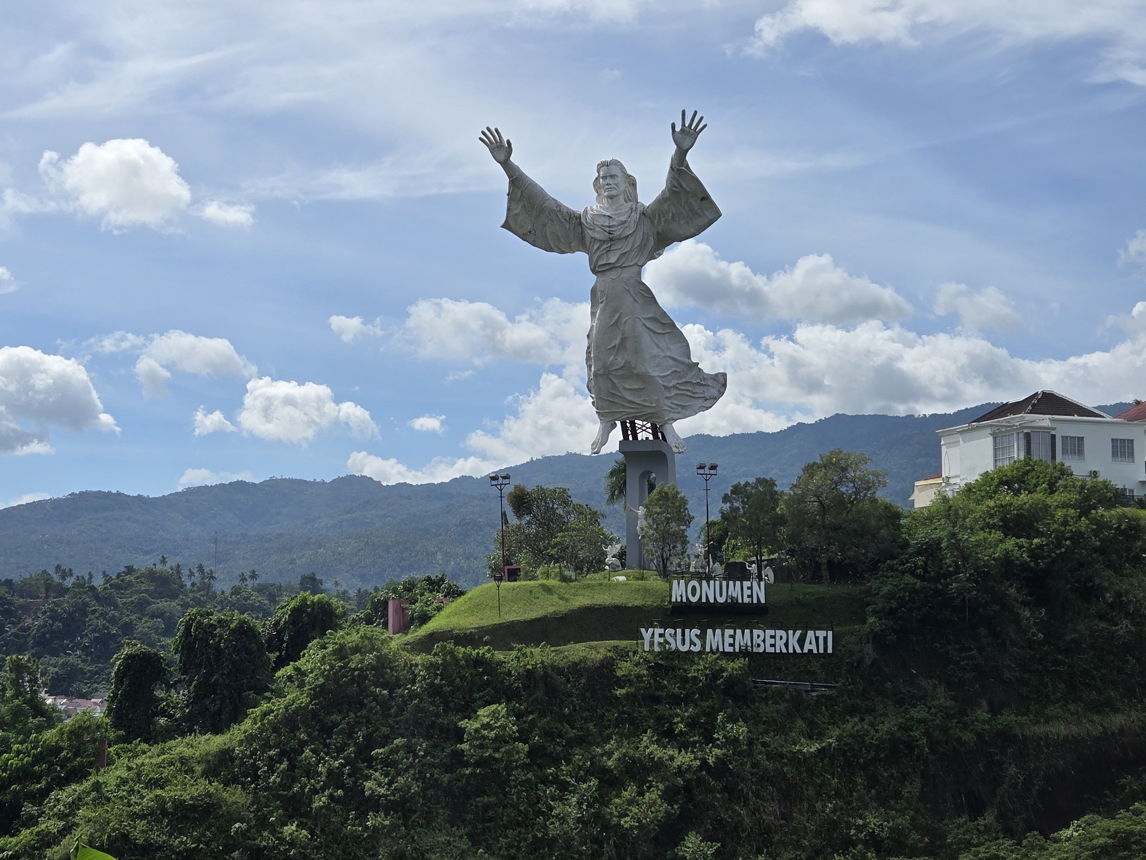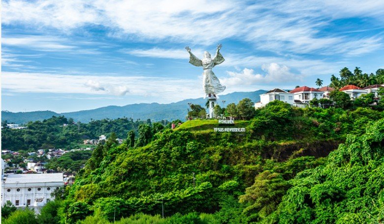 산 중턱에 위치한 50m 높이의 거대한 조형물로, 종교적 의미와 함께 평화, 관용을 표현하는 마나도의 랜드마크입니다 . 전망대에서 바로보는 모습은 선셋과 어우러져 다시 오실 예수님을 상상하며, 감사함을 고백할수 있는시간 입니다 마케테테 투어