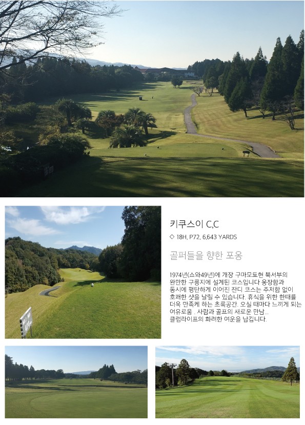 후쿠오카 국제공항 도착 점보택시를 탑승하여 골프장으로 이동 [약 60분 소요] ⛳️츠카사 로얄CC 또는 츠카사 키쿠스이CC 18홀 셀프카트 플레이 **일몰까지 플레이** 라운딩 후 호텔로 이동 호텔 체크인 후 석식 및 온천욕 ✳️ 츠카사 로얄 호텔 [스탠다드 트윈룸/2인1실] [꼭! 확인 해 주세요~] - 본 상품은 2인 이상 출발 가능하나, 단 카트&송영 추가 비용이 발생합니다.. - 셀프플레이 기준. 캐디 예약 불가능합니다. - 첫날 일몰까지 라운드 못한 비용에 대해서는 일절 환불이 불가합니다. - 석식을 드시지 않으셔도 비용은 차감되지 않습니다. (석식 L.O 19:00) ★ 골프장 셀프데이 : 츠카사 로얄 - 월요일,금요일(셀프데이시 예약불가) / 츠카사 키쿠스이 - 월요일, 목요일 - 셀프 데이에는 손님들이 골프장에서 직접 짐을 옮기셔야 합니다. 양해 부탁드립니다.(락커 사용 불가, 짐은 프론트에서 보관, 현금결제만 가능) - 셀프 데이에는 골프장 레스토랑에서 단품 메뉴를 판매하지 않습니다. - 도시락이 무료 제공됩니다. - 송영차량은 골프장을 모두 들리며 이동할 수 있고, 개인적 용도로 사용 불가합니다. - 현지 상황에 따라 인근 골프장인 더 포레스트G.C(前 나카큐슈C.C) 로 수배될 수 있습니다. - 호텔 1층 온천은 무료이며 1,300여년의 유서 깊은 타마나 온천을 즐겨보세요. { 이용 가능시간 : (오전)6:00~9:00 , (오후) ~ 24:00 } - 최근 1층 온천 이용에 있어 오입장으로 인한 사고가 잦아지고 있습니다. 푸른색 발이 걸려있는 곳은 남탕, 붉은색 발이 걸려있는 곳은 여탕이며, 매일 위치가 변경되므로 이용간 각별한 주의를 부탁드립니다. (타올은 대여되지 않으므로, 객실에서 지참 후 이용 부탁드립니다.) |
