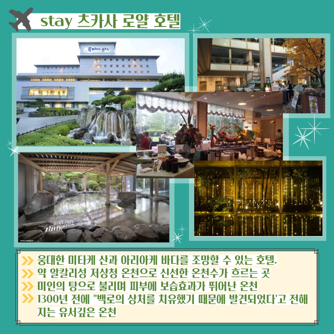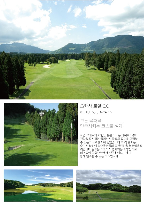 호텔 조식 후 골프장으로 이동 [약 15분소요] ⛳️츠카사 로얄CC 또는 츠카사 키쿠스이CC 18홀 셀프카트 플레이 라운딩 후 호텔로 이동 호텔 체크인 후 석식 및 온천욕 ✳️ 츠카사 로얄 호텔 [스탠다드 트윈룸/2인1실] |